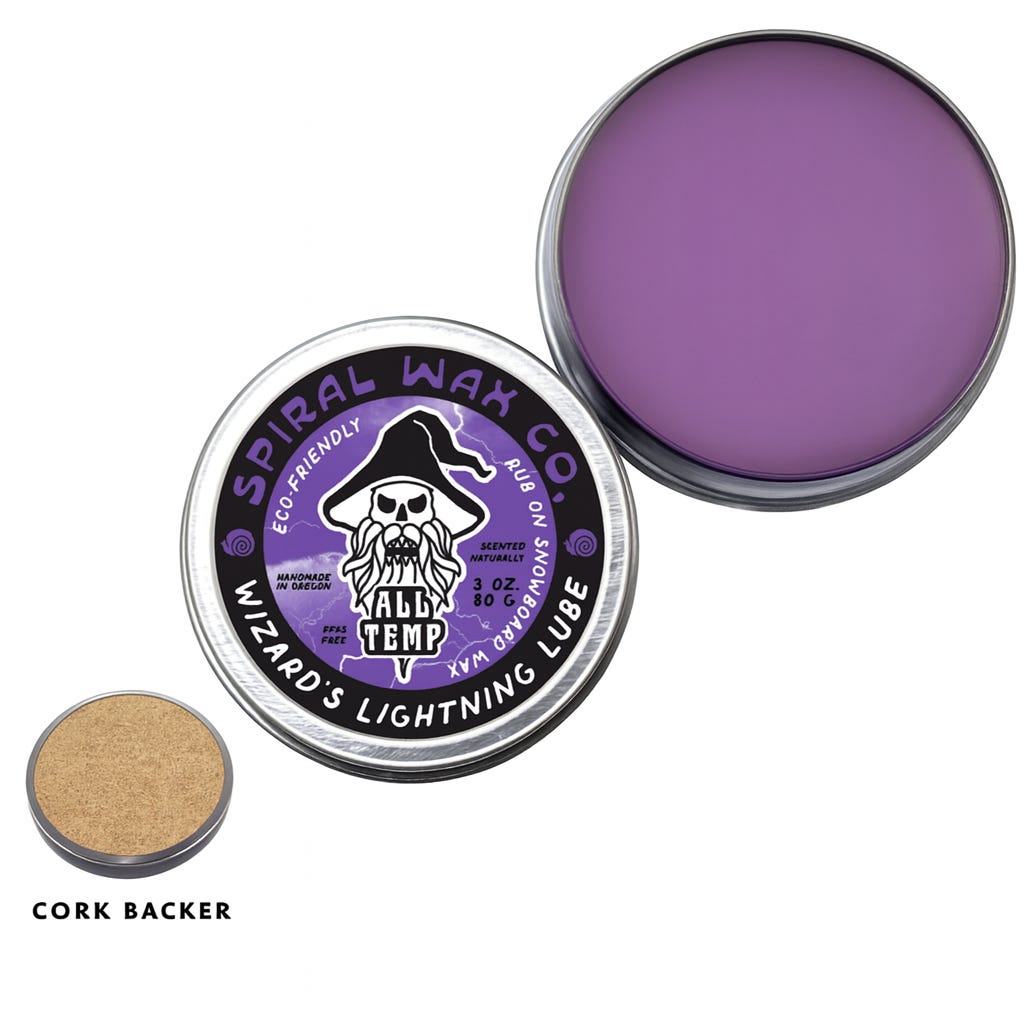 Rub-on Wax: Spiral Wax Co. Wizards Lightning Lube: When the meltdown begins and the snow is riding dirty, slushy, and sticky, a fast-acting, easy-applying glide wax will get you sideways sliding smoothly once again.